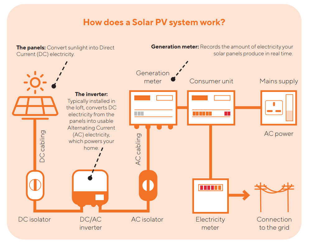 • The inverter is an essential requirement in Solar PV systems and will normally be fitted in your loft or garage. The inverter converts the electricity produced by the solar panels into usable power for your home.
