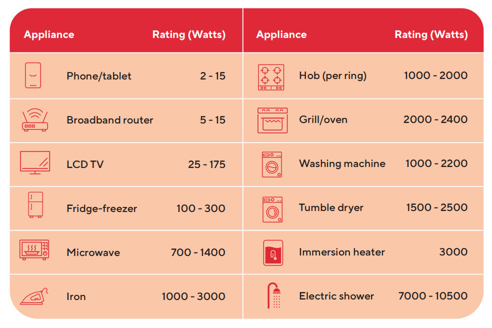 In ideal conditions, each panel may generate around 400 to 450W of power. It may be helpful to understand the standard amount of energy your household appliances may use. The electricity used by appliances will vary between makes and models, you can use the general guide below.